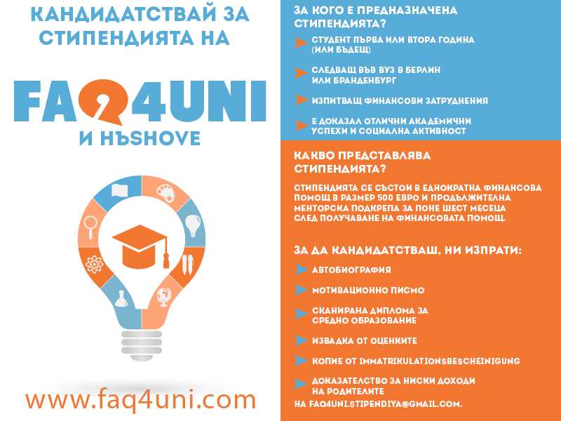 Екипът на FAQ4UNI и организацията на българските студенти в Берлин и Бранденбург HЪSHOVE търсят кандидати за първата по рода си стипендия, която е съвместен проект на двете организации и българи, завършили в Германия. FAQ4UNI и HЪSHOVE играят ролята на посредници между млади български студенти, които имат нужда от финанскова подкрепа и менторски насоки, и вече завършили българи, които живеят в Германия и имат желание да помогнат на начитаещите студенти.