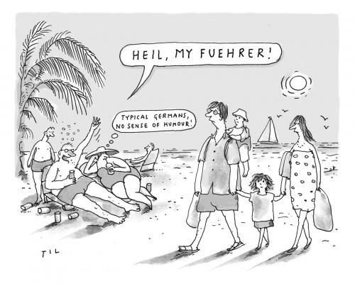 пулят се срещу вас и започват на висок глас да говорят за шваби, Хитлер и аутобани. (Nota bene: минете предварително на оглед по стените на блоковете около апартамента ви, за да превърнете всички издраскани със спрей свастики в прозорчета). Естествено, непрекъснато срещате други немски туристи, които деликатно подвикват към вас като ви чуят да говорите на немски нещо от сорта на „HALLO! WIR SIND AUCH DEUTSCHE! WAS MACHT IHR HEUTE ABEND SO?!?”, а немските ви приятели навеждат засрамено глава и си пожелават никога повече по време на престоя си в България да не срещнат сънародници.