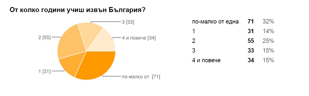 Съставих една кратка анкета и помолих приятелите си да я попълнят. Когато погледнах резултатите, с изненада установих, че е попълнена от точно 224 души! Зарадвах се да видя, че на толкова много хора им е било интересно да споделят. И все пак кой точно участва в анкетата? Всички са студенти на възраст между 18 и 35 години, които са избрали да следват в 39 различни града в Европа. Най-активни са били студентите във Виена, следвани от Берлин и Мюнхен, но има и участници от Франция, Великобритания, Украйна, Белгия, Холандия и Русия. Повечето от тях са софиянци, но освен тях са се включили хора, които идват от 30 различни града в България. Един студент изрично е посочил, че е от Люлин.