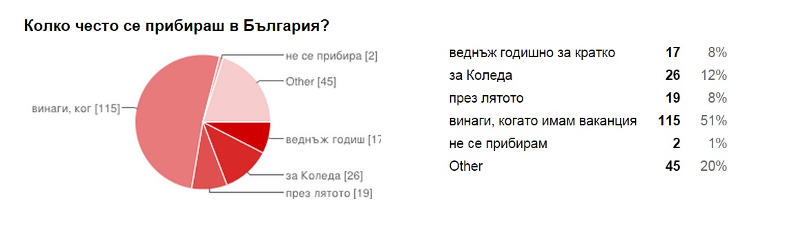 Можем само да се надяваме, че повечето от участниците в анкетата, както и всички студенти в чужбина, няма да се вслушат в този съвет и ще продължат да се прибират в България винаги, когато имат възможност. А кой знае, може би след като завършат, ще изберат да се върнат обратно. Да останат там, където са семейството, планините, морето, вкусната храна и да потърсят начини да направят от родината точно толкова желана дестинация, колкото страните в Западна Европа.
