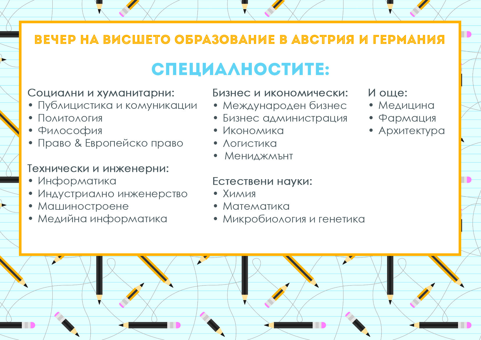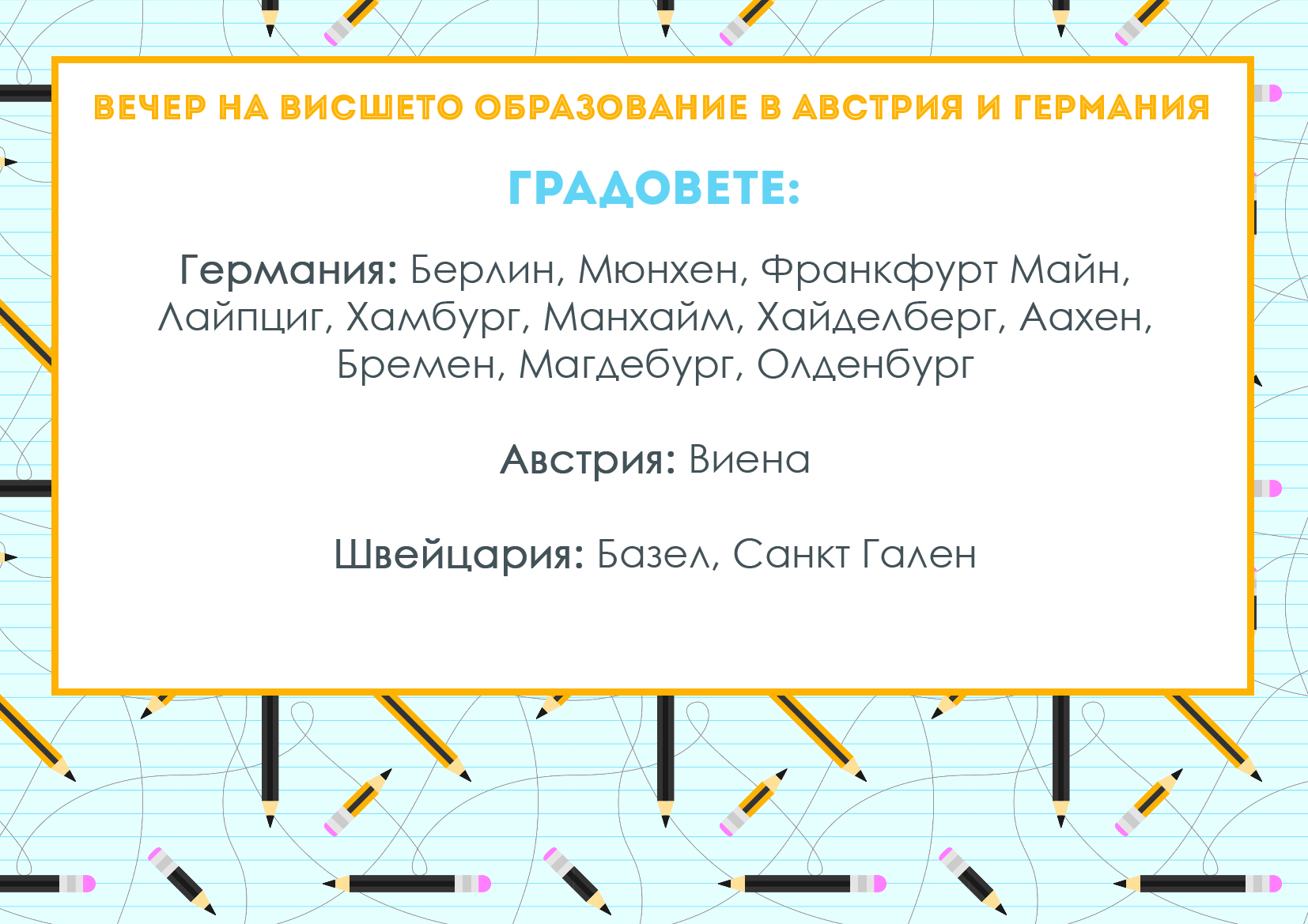 „Вечер на висшето образование в Германия и Австрия“ ще се проведе на 2 април във „Фабрика 126“ на Бул. „Княгиня Мария Луиза“ 126 в София. Безплатната регистрация за събитието ще бъде отворена на 28 март, а за повече информация можеш да следиш страницата на събитието.