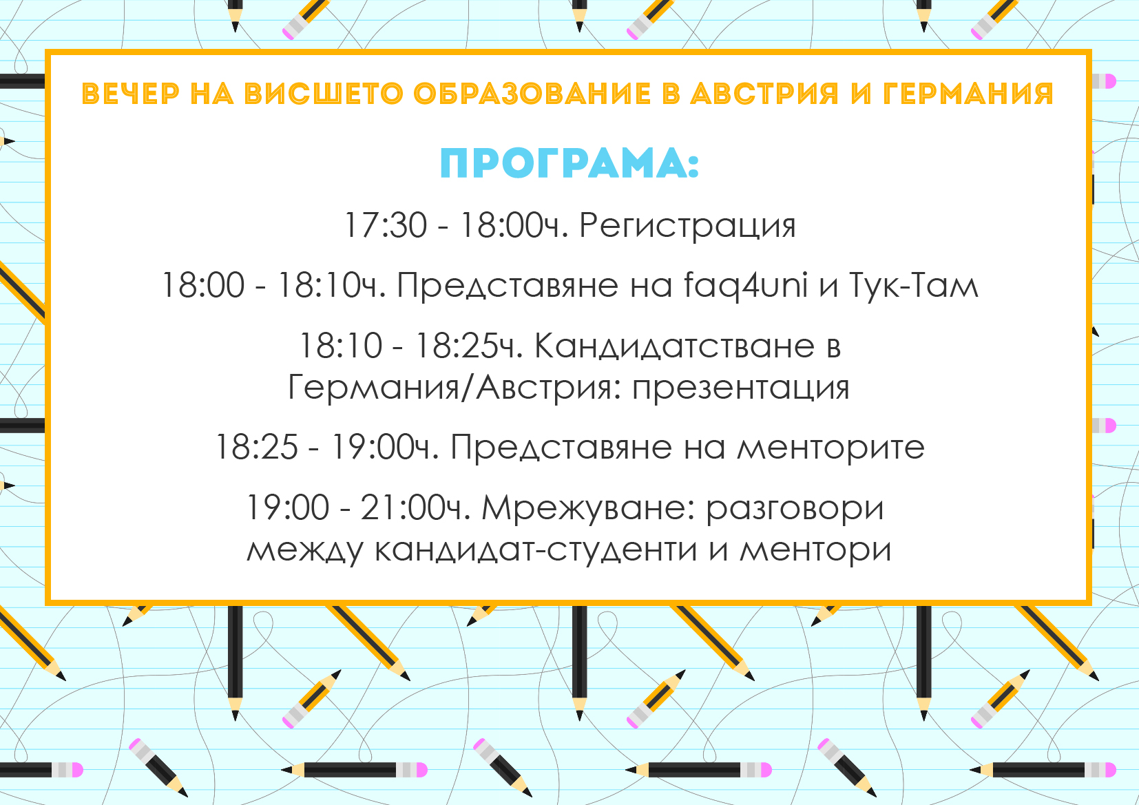 „Вечер на висшето образование в Германия и Австрия“ е съвместна инициатива на сдружение Тук-Там и faq4uni.com, която ще представлява неформална среща за споделяне на опит, знания и контакти между успешно завършили и настоящи студенти в Германия и Австрия и кандидат-студенти, които се интересуват от възможностите за обучение зад граница.В рамките на вечерта учениците и студентите ще могат да се запознаят и поговорят с български студенти, следващи или завършили немски или австрийски университети в различни специалности. Освен приятните разговори, ще представим подробно важните въпроси за кандидатстването и образованието в Германия и Австрия.