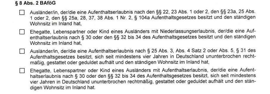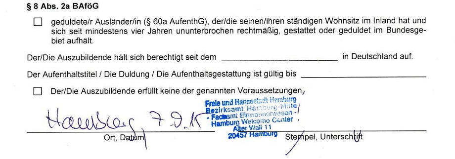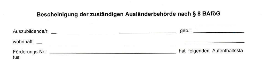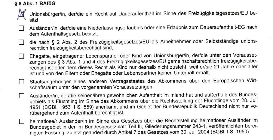 BAFöG могат да получават немски граждани и европейски граждани, които имат право да пребивават за постоянно на територията на Германия. За това ви е нужно свидетелство – Bescheinigung der zuständigen Ausländerbehörde (може да намерите прикачен образец на последна страница), чиято бланка получих от BAföG-Amt. За заверката на свидетелството съветвам да отидете в Bezirksamt (общината) в съответния град, където трябва да се подпише документа. Ако ви откажат в общината (но не би трябвало!), опитайте и в Ausländerbehörde офиса. Никой не ме е питал от колко време съм в Германия, колко съм работил и т.н., а просто получих подпис и печат в общината, след като казах, че съм българин и гражданин на ЕС. След като завери свидетелството, студентът има право да подаде документи за BAföG!